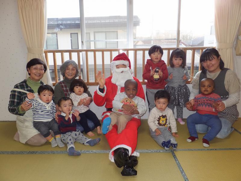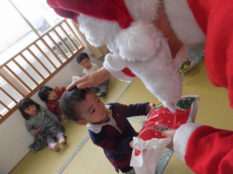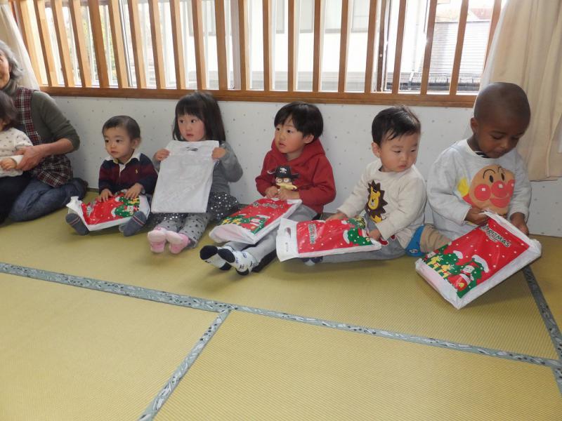 みんな真剣にみてましたよ、メリメリクリスマス、トゥユウ・・・一緒に歌って待っているうち、聞こえてきました、鈴の音!わっ、サンタクロース!!一瞬、固まってしまった子もいたけれど、目はサンタに釘付けです。だって、サンタだよ、ほんものだよ、おっきなふくろももってるし・・・。まり先生が、ふくろを預かってのぞいてみると、なんとプレゼントがいっぱい入ってたんだって!名前を呼ばれ、ひとりずつ、どきどきしながらサンタさんのところにいって、プレゼントをもらい、一安心。ヨンタさんじゃなくて、ほんとによかった!!ヨンタさんだったら、プレゼントなんかもらえないところだった、というのが一番大きいお兄さんの感想だったらしいけど、プレゼントをもらうのも緊張、緊張のこどもたち。でも、また来年来てね、と手を振って、クリスマスは終わっちゃたね、ちょっぴりの虚脱感!そのあと、おやつを食べてようやく普段に戻ったみんなです。楽しかった?もうプレゼント開けてみた?