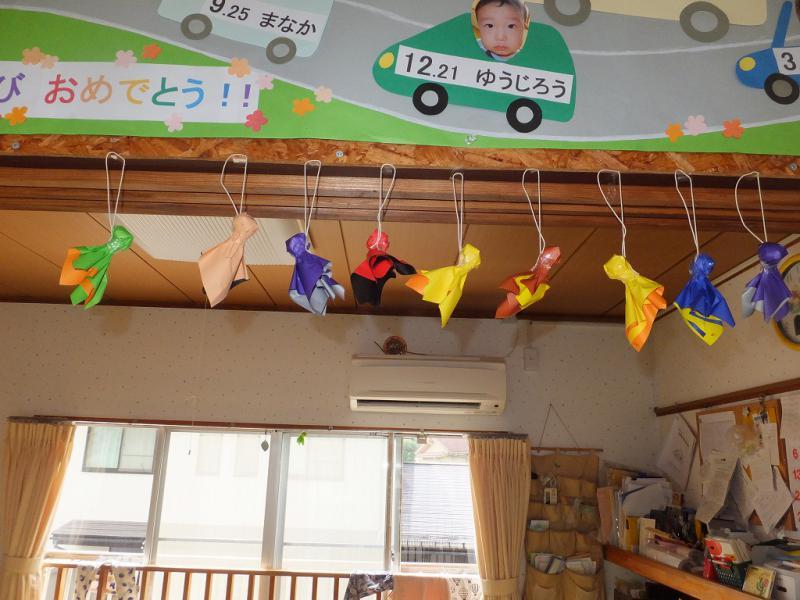 テルテル坊主なんて、ちょっと前まではごくごく一般的なものだったんですけど、今日はゆき子先生、テルテル坊主の説明に苦労したらしいです。レインコートをきたこどもみたいな、という説明でなんとなくわかったみたい、ということですが、てるてるぼうずもいつの間にか「過去の遺物」になっていたんですね。保育室では今、いろんな色のレインコートをきたこどもたちが、ずらりと並んでいます。