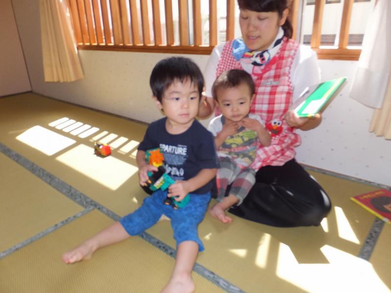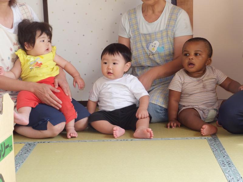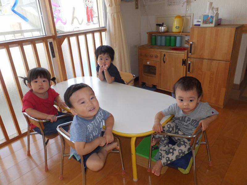 雨で部屋遊びが多かったせいか、0才さんのハイハイやアンヨ、ずいぶん上手になりました。テーブルで伝い歩きをするMちゃん、手をはなすのはちょっと怖いので、ぐるぐるぐるぐるきりなく周りをまわっているのもご愛嬌です。Ⅴくんはハイハイがとっても上手になったのに、自分からは動こうとせずに、誰かここにきてよー、と騒いでることが多いんです、ほらほら、動いて動いて!