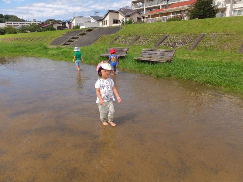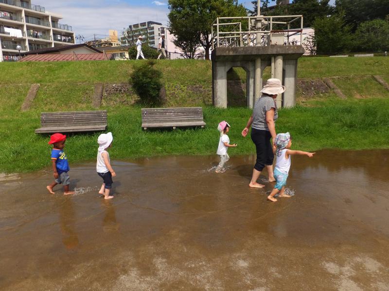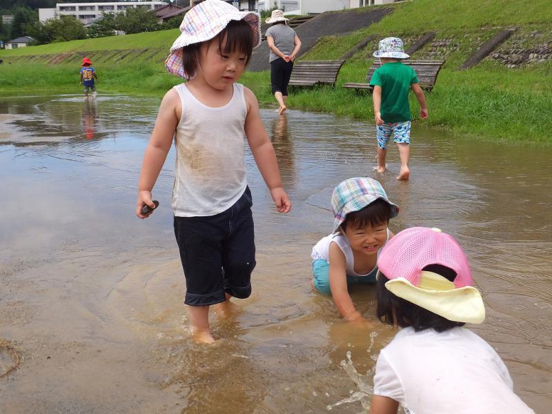 「いつもお散歩にいく原っぱが昨夕の大雨で大きな水たまりになっていて、そこで裸足になって遊んできました。水をかきわけてどこまでも進んで、泥のグニュグニュを足で踏んで、時々ステンと転んで大笑いして!“楽しいな”といいながらずっと遊んでとても満足していました。力を出し切って疲れてしまったようで、お布団にはいるとすぐに夢の中でした」