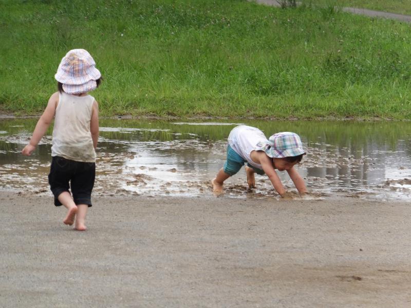 なかにはみずたまりー泥んこー汚れる、という連想で引き気味の子もいるにはいるのですが、そんなこどもたちも一旦、一面の湖状態をみると、はりきってしまうらしく、深みに石を投げ入れて宝探しをしたり、じぶんがブルドーザーになって泥んこのなかを進んだり、と大盛り上がり、しまいには「帰りたくな~い」ということになります。泥んこ足にビニール袋の靴下をはいてから、靴を履き、それがまた面白くて・・・と、大興奮の外遊びでした。汚い、やめてほしい、というおかあさんのいないおひさま原っぱ、かんがえてみたらこれもまた、ありがたいことです。また、こんな機会があるといいな、と思います。
