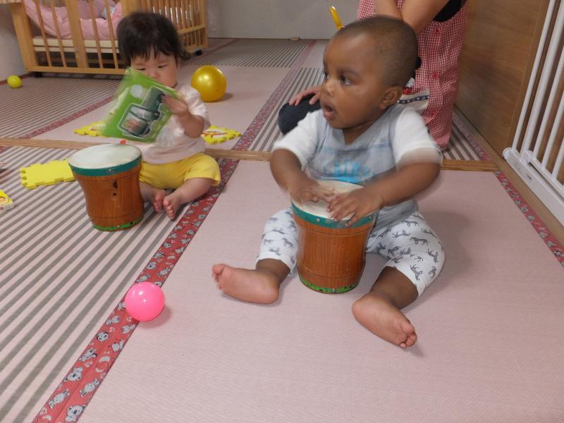 赤ちゃん部屋では、ボンゴをたたいて景気をつけています。もうそろそろアンヨができそうなAくん、2か月も下なのに負けじとたっちに励み、できればアンヨまでこぎつけたいMちゃん、我が道をいくⅤくん、三者三様、共通の趣味は「食べること」ですかね。