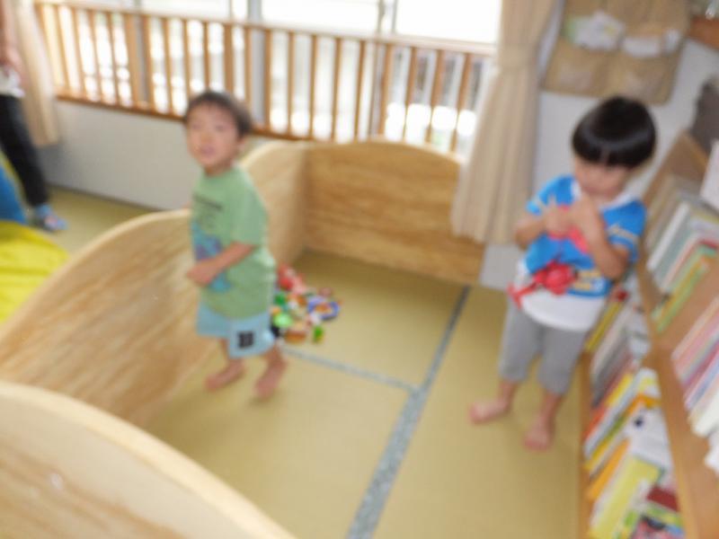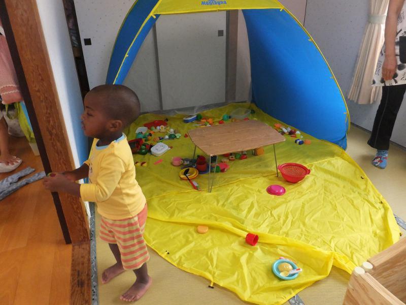 今日は、またしても雨!お部屋にテントを張ってもらって、(といっても引っ張ればできあがるというお手軽テントですけど)もう一方には衝立でおうちをつくってもらって遊んでます。人数が少なくて迫力に欠けるところはありますが・・・お店屋さんを開きながら、なぜか“バレー”のポーズをとるのに一生懸命なS君、ヘリコプターをまわすのに夢中のH君、いつもならもめる相手がいるのに、平和すぎるのもなんだかな、という感じでしょうかね!