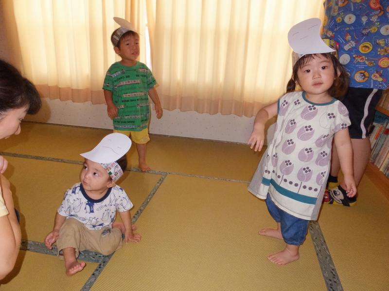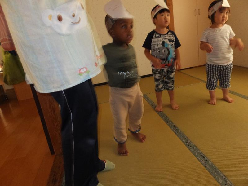今日も雨に降りこめられたこどもたち、さとこせんせいがおばけのかぶりものをつくってくれました。カーテンをしめてちょっと暗くした部屋で「おばけなんかないさ」とひと踊り、みんなで赤ちゃん部屋や、台所に顔をだしておばけのご挨拶をしてきました。