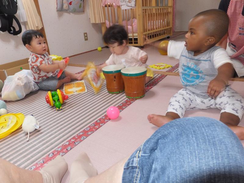 赤ちゃん部屋では、ボンゴをたたいて景気をつけています。もうそろそろアンヨができそうなAくん、2か月も下なのに負けじとたっちに励み、できればアンヨまでこぎつけたいMちゃん、我が道をいくⅤくん、三者三様、共通の趣味は「食べること」ですかね。