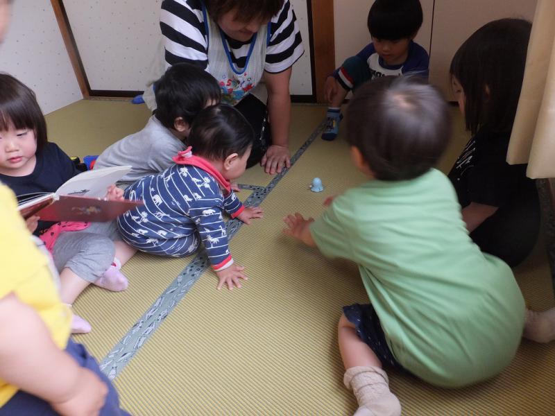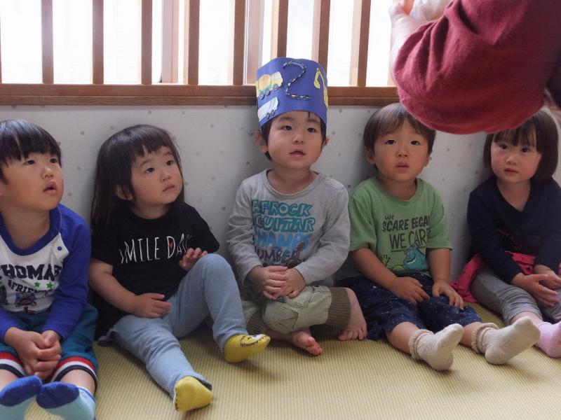 泥んこはほんの少し苦手でも、川で石投げするのはだーいすき、探検ごっこもだーいすき!本格的な夏になる前、もう汗まみれであそんでいるこどもたちです。太いイタドリの茎なんぞを担いで帰ってくる様子をみると、つくづく自然児だなー、と思います。でも部屋の中だって、そんな感じ、体操や手押し車できたえているところです。写真はお誕生会の日のひとこまです!