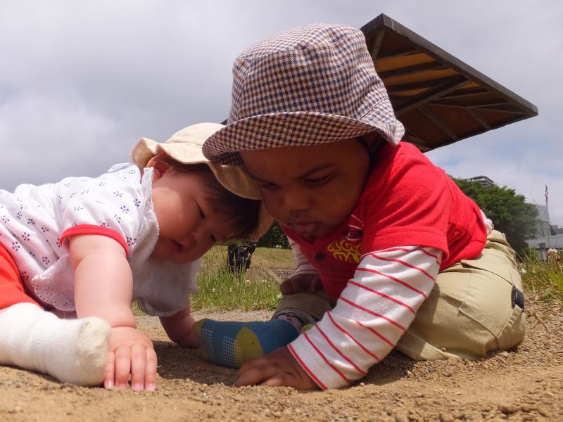 梅雨に入ったとはいえ、結構いい天気が続いています。先週末には、今年初めての泥遊び。泥んこが乾いて白っぽくなった0才児さんたちも、意気揚々とベビーカーに乗せられて帰ってきました。川から水を汲んできて泥んこをつくり、おだんごをつくったり、型抜きをしたり、泥にはちょっと抵抗のある子もいるにはいるけど、泥んこ遊びってやっぱり楽しいよね。すこしずつ慣れてくれると嬉しいな!