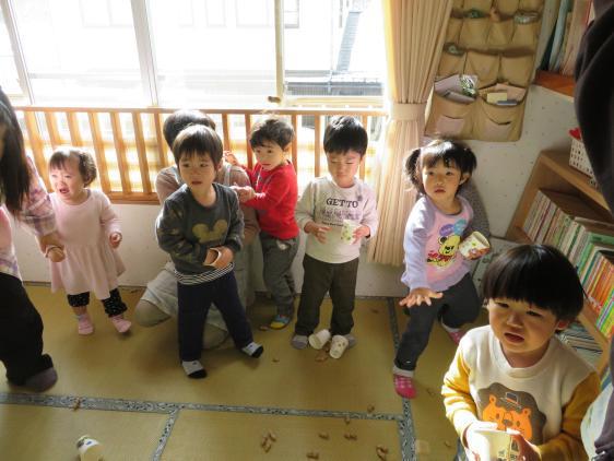 立春を明日にひかえ、雪の朝になりました。いわずと知れた今日は節分、鬼が出るか蛇が出るか、ドキドキのこどもたち!このところ「鬼は~そと~」と、豆をぶっつける練習をし、鬼がきても泣かない、先生の後ろに隠れない、などとかたく誓っていたのですが、本番はどうなるか!!若干、表情もこわばっているような・・・。さて、そろそろ来るかな?鬼さんから、近くまできた、という電話もあったことだし・・・豆の入った紙コップを手に、戦闘の構えに入ったこどもたちの前に窓ガラスにうつった鬼が一匹!見た途端に大号泣の子一名、と思う間にもう一匹の鬼出現で、保育室はたちまち大騒ぎです。涙をこらえ、口をギュッと結んで豆を投げる子、鬼に捕まって泣き出す子、できるだけ目立たないように陰に隠れようとする子、それやこれやの騒ぎの末、鬼は退散し、こどもたちはふっと力が抜けたよう・・・こわかったねぇ、でもがんばったねぇ、泣いた子も、泣かずに戦った子も、みんなで座り込んで、さっきの出来事を振り返っています。そして聡子先生の論功行賞!こわいのをがまんしてがんばって豆を投げた三人は、一番たくさん、甘納豆のご褒美をもらいました。そのほかの子も働きに応じて(?)・・・大泣きした子も、捕まっちゃった子も・・・それぞれ甘納豆をもらってほっと安心、元気に雪のなかへ遊びにでていきました。この頃はかのなまはげも優しくなっているのだとか、でも、おひさま原っぱの鬼たちはまだまだ怖いよー!!