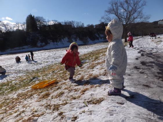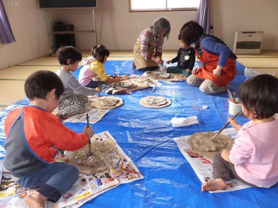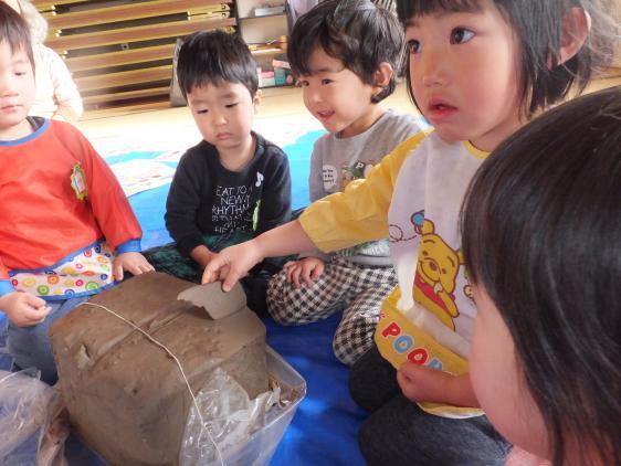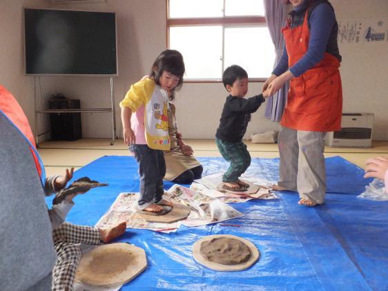 今日はひさしぶりの造形教室。ともこ先生が20キロもある土粘土の塊を持ってきてくれました。自分たちの使う粘土をその大きな塊から切り取るのもなかなか大変な作業でしたが、みんな結構なおおきさの粘土を貰っていよいよはじまり、はじまり!固い粘土と格闘です、手でたたいたぐらいではびくともしない粘土、平手でペタペタ、げんこでどんどん、はだしになって足踏みしたり・・・だんだん柔らかくなってきた粘土をまるめて、重ねて、またつぶし・・・。平たくなった粘土に小麦粉製のうわぐすりを塗って、へらでいっぱい模様も描きました。初めは緊張していたみんなもだんだんにほぐれてきて、歌などうたいながら楽しく粘土とたわむれました。作品はともこ先生が焼いて壁掛けにしてくれるんだって!どんなになるんだろうね、楽しみだねぇ・・・と2才児クラスがこんなことをやっていたその時間、0.1才児クラスの面々はことしはじめてのそり遊び、先生に乗せてもらったのは最初だけ、なんと自分たちだけで乗れるようになったんだって!びっくりでしょ?今日はなんて面白い日だったんでしょうね、みんな!