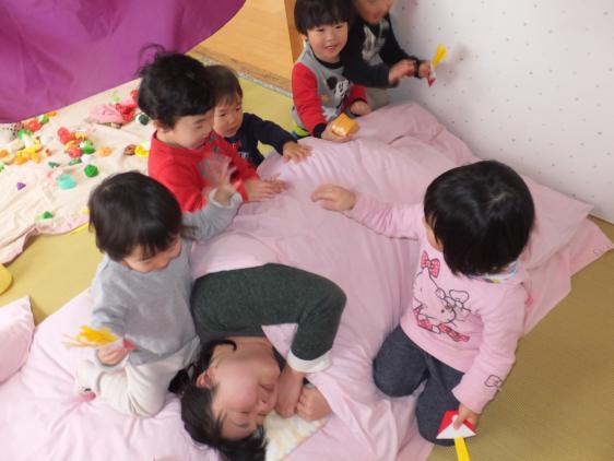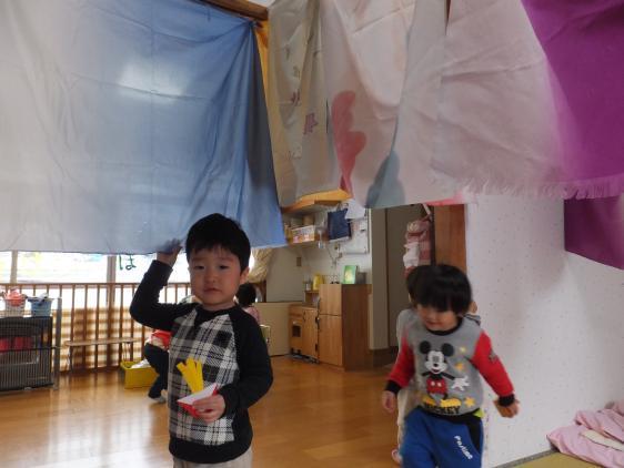 大寒らしい寒い日が続きました、雪が降ったりして、お散歩に行けない日もありましたが、部屋遊びはそれなりに盛り上がって楽しそう!仕事が一段落して保育室に戻ると、なんと風呂敷がいっぱいぶら下がり、隅っこにはお昼寝布団が敷いてあるじゃありませんか!みんなで保育園ごっこをしてたんですって!こども役のせんせいがいつまでも起きないで、グズグズゴロゴロしていると、みんなで「起きてー!」の大合唱・・・それでも起きないでいると、業を煮やした、最年長のS子せんせい、「じゃ、寝てなさい!!!」そういえばそんなやりとり時々やってるよね、よく見てること、うっかりできないね、と、大人は大笑い。ごっこあそびやら、間近になった節分の準備やら、外にいけなくても結構楽しめます。そう、クリスマスの次のイベントは豆まきですからね、鬼のつのをつくったり、豆まきの練習をしたり、いろいろ忙しいんですよ、こどもたち!そして先生たちも大好きな節分を楽しみにしてるんです、鬼は何匹にしよう、どこからあらわれよう、どの子をつかまえよう、なんてね。