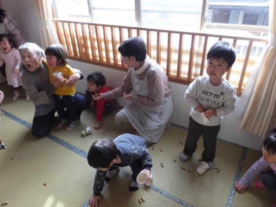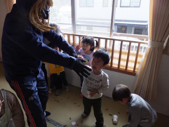 立春を明日にひかえ、雪の朝になりました。いわずと知れた今日は節分、鬼が出るか蛇が出るか、ドキドキのこどもたち!このところ「鬼は~そと~」と、豆をぶっつける練習をし、鬼がきても泣かない、先生の後ろに隠れない、などとかたく誓っていたのですが、本番はどうなるか!!若干、表情もこわばっているような・・・。さて、そろそろ来るかな?鬼さんから、近くまできた、という電話もあったことだし・・・豆の入った紙コップを手に、戦闘の構えに入ったこどもたちの前に窓ガラスにうつった鬼が一匹!見た途端に大号泣の子一名、と思う間にもう一匹の鬼出現で、保育室はたちまち大騒ぎです。涙をこらえ、口をギュッと結んで豆を投げる子、鬼に捕まって泣き出す子、できるだけ目立たないように陰に隠れようとする子、それやこれやの騒ぎの末、鬼は退散し、こどもたちはふっと力が抜けたよう・・・こわかったねぇ、でもがんばったねぇ、泣いた子も、泣かずに戦った子も、みんなで座り込んで、さっきの出来事を振り返っています。そして聡子先生の論功行賞!こわいのをがまんしてがんばって豆を投げた三人は、一番たくさん、甘納豆のご褒美をもらいました。そのほかの子も働きに応じて(?)・・・大泣きした子も、捕まっちゃった子も・・・それぞれ甘納豆をもらってほっと安心、元気に雪のなかへ遊びにでていきました。この頃はかのなまはげも優しくなっているのだとか、でも、おひさま原っぱの鬼たちはまだまだ怖いよー!!