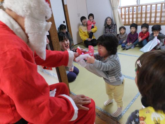 年末とは思えないあたたかさ、雪もないのにサンタクロース、きてくれましたよ。ぎりぎりまで、あやうい人はいたものの、みんなサンタクロースからプレゼントをもらい、うたったり、おどったりの楽しいときをすごしました。ヨンタさんじゃなくて、ほんとによかったね!12月に入って、クリスマスの絵本をいっぱい出してきたのですが、今年はあまり興味がわかなかったみたい。“あきのはやしにふるふるふるよ・・・“の「どんぐりずもう」がかわらぬ人気で、紙相撲ならぬブロック相撲の、箱をとんとんとんたたく音が毎日きこえています。クリスマスの製作もずいぶんしたし、カレンダーにしるしをつけて、楽しみに待ってはいたのですけれど、今ひとつ盛り上がりに欠けたのは、こどもたちの年齢のせいかもしれません。そうそう、サンタクロースの証拠写真を幼稚園にもっていったKちゃん、こんなことをいっていました。「サンタクロースはね、来たんだけど、なんと園長先生だったのよ!」と残念そうな口ぶり、「そうか、おひさま原っぱのサンタさんは本物だったのにね」「そう!」遠いところから、はるばるきてくれたおひさま原っぱのサンタさん、また来年もよろしくおねがいしまーす!