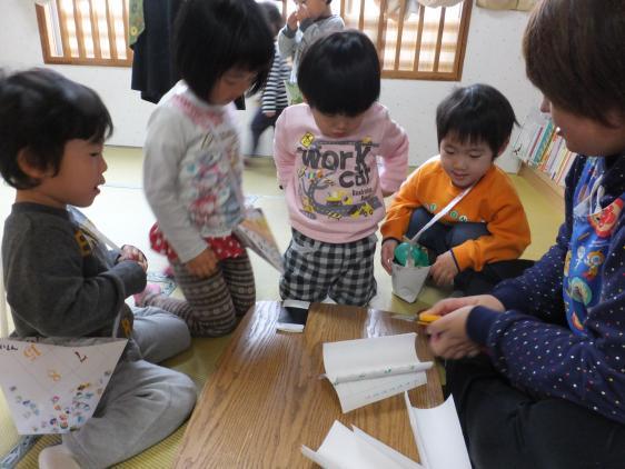 年末とは思えないあたたかさ、雪もないのにサンタクロース、きてくれましたよ。ぎりぎりまで、あやうい人はいたものの、みんなサンタクロースからプレゼントをもらい、うたったり、おどったりの楽しいときをすごしました。ヨンタさんじゃなくて、ほんとによかったね!12月に入って、クリスマスの絵本をいっぱい出してきたのですが、今年はあまり興味がわかなかったみたい。“あきのはやしにふるふるふるよ・・・“の「どんぐりずもう」がかわらぬ人気で、紙相撲ならぬブロック相撲の、箱をとんとんとんたたく音が毎日きこえています。クリスマスの製作もずいぶんしたし、カレンダーにしるしをつけて、楽しみに待ってはいたのですけれど、今ひとつ盛り上がりに欠けたのは、こどもたちの年齢のせいかもしれません。そうそう、サンタクロースの証拠写真を幼稚園にもっていったKちゃん、こんなことをいっていました。「サンタクロースはね、来たんだけど、なんと園長先生だったのよ!」と残念そうな口ぶり、「そうか、おひさま原っぱのサンタさんは本物だったのにね」「そう!」遠いところから、はるばるきてくれたおひさま原っぱのサンタさん、また来年もよろしくおねがいしまーす!