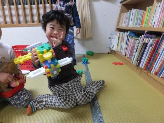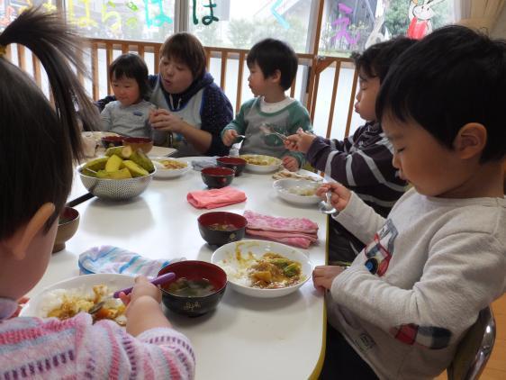 11月11日は11並びで、独身の日だの、チンアナゴの日だの、いろいろあるようですが、保育園ではカレーライスパーティーの日でした。カレー、カレーと2歳児クラスのこどもたちが首をながくして待っていたんです。壁には早々とこどもたち製作の「カレーライス」が貼りだされ、絵本だの、エプロンシアターだので、気分は否が応でも盛り上がっています。当日は、みんなで人参、じゃが芋、玉葱を切り(あ、もちろん大人が手を添えて、ですよ)、大きな鍋でじゃかじゃか炒め(うっかり煙探知機の下で、やったものですから「火事です、火事です」と警報が鳴り響くハプニングつき)、コックさん気分も十分味わいました。いつもは別々のテーブルに着く1,2歳クラスですが、1歳さんと先生もご招待してみんな一緒に「いただきまーす」まぁ、食べること、食べること!いつもはやっとやっと食べている子も、2杯、3杯、とお代わりして、おなかはパンパン!おいしかったんですって!!よかったねー。おなかいっぱいで、おやつのお結びはさすがに残ってしまいました。今度はなにをつくるー?