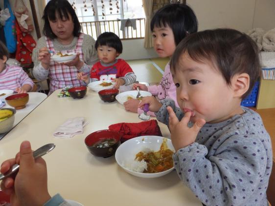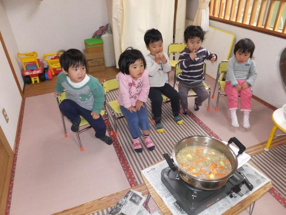 11月11日は11並びで、独身の日だの、チンアナゴの日だの、いろいろあるようですが、保育園ではカレーライスパーティーの日でした。カレー、カレーと2歳児クラスのこどもたちが首をながくして待っていたんです。壁には早々とこどもたち製作の「カレーライス」が貼りだされ、絵本だの、エプロンシアターだので、気分は否が応でも盛り上がっています。当日は、みんなで人参、じゃが芋、玉葱を切り(あ、もちろん大人が手を添えて、ですよ)、大きな鍋でじゃかじゃか炒め(うっかり煙探知機の下で、やったものですから「火事です、火事です」と警報が鳴り響くハプニングつき)、コックさん気分も十分味わいました。いつもは別々のテーブルに着く1,2歳クラスですが、1歳さんと先生もご招待してみんな一緒に「いただきまーす」まぁ、食べること、食べること!いつもはやっとやっと食べている子も、2杯、3杯、とお代わりして、おなかはパンパン!おいしかったんですって!!よかったねー。おなかいっぱいで、おやつのお結びはさすがに残ってしまいました。今度はなにをつくるー?