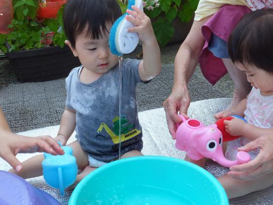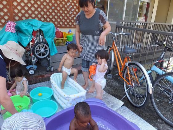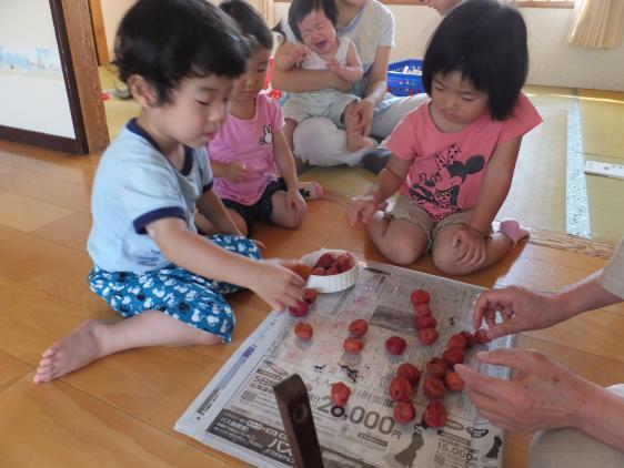 あっついねぇー、が挨拶代わりのこのごろ、かんかん照りの屋根の上に梅干しをほし、人形たちを丸洗いにしておなじく屋根にならべ、強い日差しを最大限に利用しています。ことしの梅干しはきっといい出来になるでしょう!紫蘇もほして「ゆかり」にしようとしているところなのですが、これがなかなかにこどもたちに人気で、すこしづつ口にいれてもらうのを、順番をつくって待ってます。まぁ、この暑さですから塩分補給にいいかもしれません。毎日毎日、水遊び!時々、かきごおりをつくってもらったり、色水をこおらせてプールに入れて遊んだり、夏を満喫しているこどもたち、そのあとにお昼寝が待ってるっていうのが、うらやましい・・・!