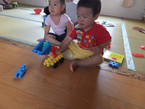 帽子のなかで風のおとがします。葛の花のかおりがかすかに漂い、のうぜんかずらや百日紅が今まっさかり・・・じりじりした陽射しはまだ夏のものだけど、空の色、風の感じは秋をおもわせます。ひぐらしのこえももうほとんどきこえなくなってしまいました。ぽつりぽつりと夏休みの子がいて、保育園もなんとなくお休みムード、このところ全員出席という日がないので、結構静かですよ!ブロックが使いたい放題なので、ブロック愛好家諸君は腕があがりました、あたまに描くイメージがあるので、なまじ手伝わない方がいいみたいで時間をかけて、じっくり作っています。やっと満足のいくものができたときの、嬉しそうな顔ったらありません。「すごーい、やったぁ!だれがつくったの?」「サト!」せんせぇ、作って、じゃなくて“じぶんで”がいいなぁ!ブロックってむずかしいですよ、形が決まっているので、なかなか思い通りにならないし、バランスが悪いとくずれるし・・・。まだ1才、2才なのに、すごいなぁと思います。