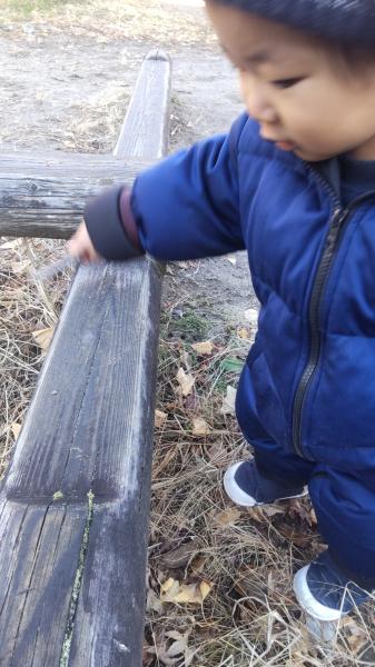 こっちもたたいてみる?と 近くの 木の遊具を たたいたら