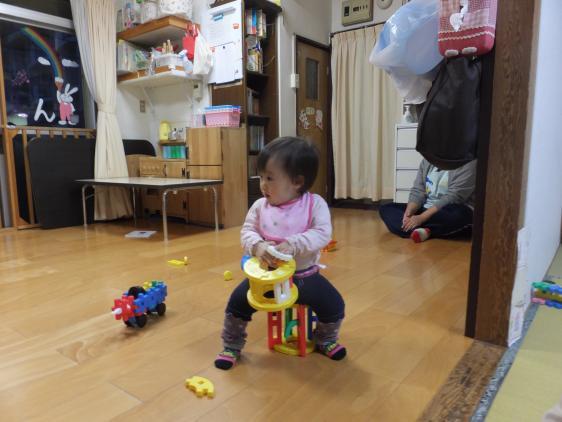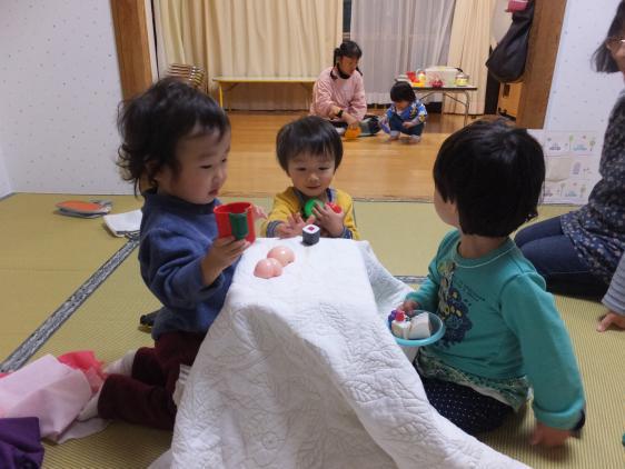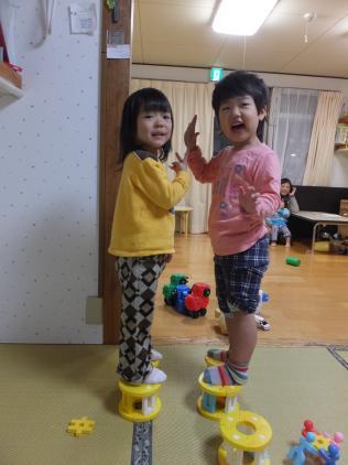 ☆ 猛威をふるった風邪(一部RSウィルス)もようやくおさまってきました。まだ、後遺症の咳はのこっていますが、どうやらいつもの出席数になって賑やかさが戻っています。この頃、ブロックの使い方が上手になっていろいろと面白いものができるようになりました。2才、3才ともなるとなかなかの発想、作ってぇ!ばかりじゃなくなりました。大作ができて壊すのが惜しい時には、記念写真をパチ!自分の好きな色、好きなかたちを独り占めにして、けんかがはじまるときもありますけれどね。