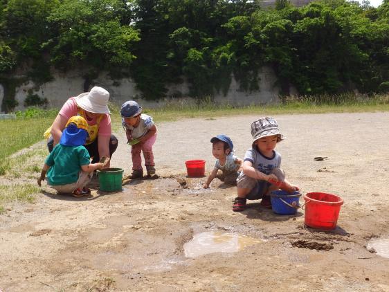 ☆ 新しくはいったこどもたちも保育園の生活に慣れてきました。おまけに5月に入ってからは、4才と3才のお兄さんたちがいてくれるので急に活気が出てきて、とても賑やか!やっぱり大きい子がいるのっていいなと、とつくづく思います。残念ながらもうすぐいなくなるんですけどね・・・泥んこ遊びで、チョコレートの池の中に落っこちたみたいになってみたりはじめての経験をする子もいるわけで、泥んこヤダヨー!と泣きの入る部分もあったりしてね!たのしいよ!!今の季節、一番人気はカラスノエンドウの種集め。黒く熟れたさやをふくろにつめるのを楽しみにしている子、毎年いるんです、さやにちょっと爪を立ててプチッとはじける感触がいいんですかね。さくらんぼを集めるのも楽しいし、今日なんか、はやばやとプールまでてきちゃった!遊びがしごと、はいまのうちだけ、いっぱい遊んでちょうだいな!