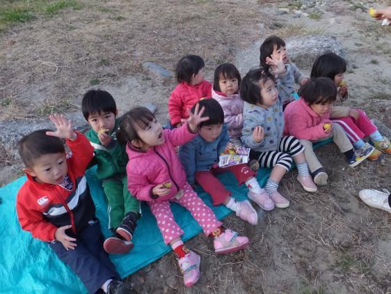 ☆ ことしも焼き芋パーティ、できましたよ!3時のおやつに合わせるのでお昼寝を少し早めに切り上げ、眠い目をこすりこすり。ついついぐずぐず、だらだらになりがちで、去年は参加できない子もいたんですけど、今年は何とか大丈夫でしたね。場所は芋煮会をする河原、ドラム缶のなかではみんなであつめた桜の葉がボンボン燃えて、お芋もほどよい焼け具合!こどもたちもひとりひとりお芋を火の中にいれ、葉っぱも放り込んで、気分は焚火の主催者です。ホクホクのお芋をほおばって、アチチチしながらも、しっかりおかわりしてました。火を怖がる子もいるけれど、今年は割合平気で、焚火に手をかざしたりもできていました。珍しくあたたかい日で河原も快適、焼き芋パーティ大成功!でした。(あっ、赤ちゃんクラスも保育園で待機、とどけてもらったお芋をパクパク食べたそうです。)