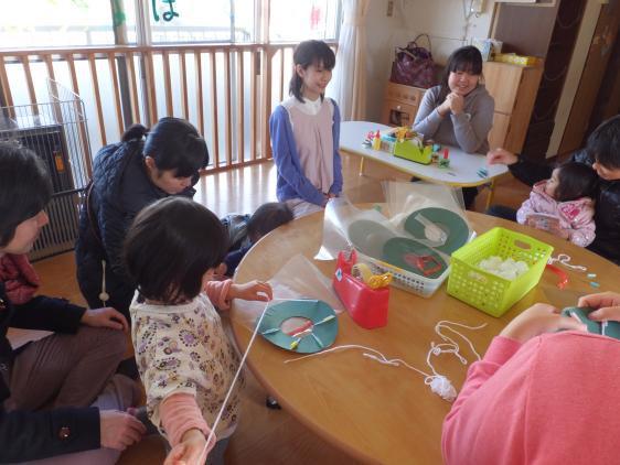 ☆ この間、久しぶりで美術館に遊びに行きました。ひろいところで走り回ったり、大きな板をすべりだいにして、みんなおおはしゃぎ。板と空間だけで、楽しく遊ぶことができるって、すてき!写真その2は、電車ごっこ。聡子先生がつくってくれた電車に乗って行き先はおさる駅に、プリン駅、ブドウ駅に、りんご駅、それからお化け駅、むかしのように、シュッシュッポっポっ、とは走らないけどでも、やっぱりたのしいよね。3番目の写真は、11月の造形教室。今度はもち網をつかってクリスマスツリーをつくりました。毛糸をぐるぐるまきつけて、ピカピカのモールや、ほしいプレゼントをかいて周りに貼って、個性的なツリーができました。クリスマス本番も、もうすぐです。オープンハウスでも、色々な飾りを作りますよ、遊びに来てくださいね!