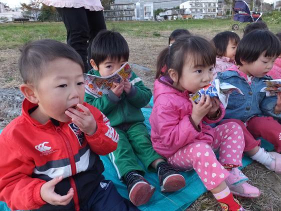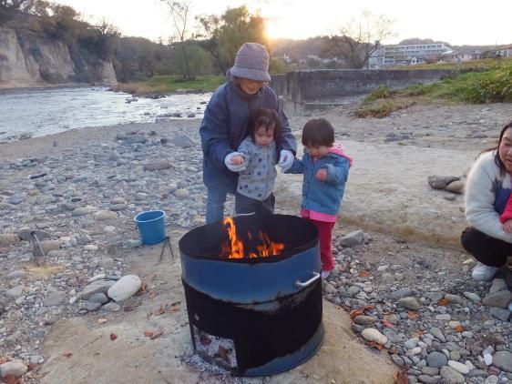 ☆ ことしも焼き芋パーティ、できましたよ!3時のおやつに合わせるのでお昼寝を少し早めに切り上げ、眠い目をこすりこすり。ついついぐずぐず、だらだらになりがちで、去年は参加できない子もいたんですけど、今年は何とか大丈夫でしたね。場所は芋煮会をする河原、ドラム缶のなかではみんなであつめた桜の葉がボンボン燃えて、お芋もほどよい焼け具合!こどもたちもひとりひとりお芋を火の中にいれ、葉っぱも放り込んで、気分は焚火の主催者です。ホクホクのお芋をほおばって、アチチチしながらも、しっかりおかわりしてました。火を怖がる子もいるけれど、今年は割合平気で、焚火に手をかざしたりもできていました。珍しくあたたかい日で河原も快適、焼き芋パーティ大成功!でした。(あっ、赤ちゃんクラスも保育園で待機、とどけてもらったお芋をパクパク食べたそうです。)