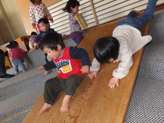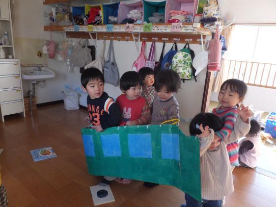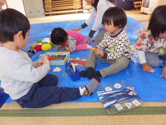☆ この間、久しぶりで美術館に遊びに行きました。ひろいところで走り回ったり、大きな板をすべりだいにして、みんなおおはしゃぎ。板と空間だけで、楽しく遊ぶことができるって、すてき!写真その2は、電車ごっこ。聡子先生がつくってくれた電車に乗って行き先はおさる駅に、プリン駅、ブドウ駅に、りんご駅、それからお化け駅、むかしのように、シュッシュッポっポっ、とは走らないけどでも、やっぱりたのしいよね。3番目の写真は、11月の造形教室。今度はもち網をつかってクリスマスツリーをつくりました。毛糸をぐるぐるまきつけて、ピカピカのモールや、ほしいプレゼントをかいて周りに貼って、個性的なツリーができました。クリスマス本番も、もうすぐです。オープンハウスでも、色々な飾りを作りますよ、遊びに来てくださいね!