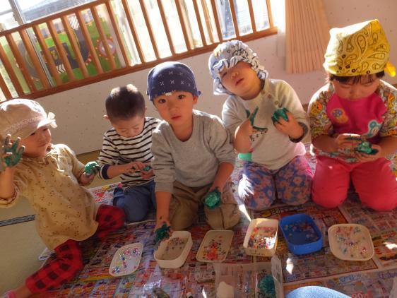 ☆ おひさま原っぱのクリスマスは12月24日。ことしもサンタクロースのところから小人たちが来て、こどもたちの行状をチェックしているらしいです。赤いノートと黒いノート、さてどっちのノートに名前が載っているのやら!年齢に応じて、クリスマスの制作に取り組むのも今の時期。2才児クラスのこどもたちが作っているのは、紙粘土のお団子型クリスマスツリー,お手手は河童のそれのように、すっかり緑にそまっていました。