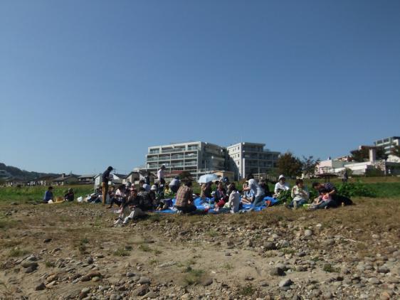 晴れた土曜日、川原のあちこちで芋煮の煙があがっていました。芋煮会の季節になりましたね!日差しがつよかったせいか、日よけのテントまで設置している用意の良いグループもみかけました。段ボールを抱えて原っぱを横切っているグループもみかけましたが、車を遠くに止めたらしく、効率を上げるのに一人で三つも段ボールを重ねて運んでいました、運動のあとの芋煮はさぞおいしかったことでしょうね。おひさま原っぱ恒例の芋煮会は来週の土曜日、食事の前には原っぱでみんなで遊びます。晴れるといいな!