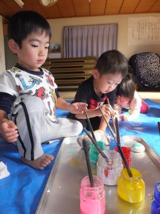 ☆ 先月末、2回目の造形教室。河原にいってみんなで石を拾ってきて、その石にマジックペンや絵の具で顔をかきました。なかなか上手でどことなく描いた本人に似ています。でも問題はそのあと、せっかく描いたのに、すぐに絵具で塗りつぶすんだもの!筆をつかう面白さが最優先なんですよ!!それもまた、楽し、みんな、おもーい石のはいった袋をうんこらしょ、とかついで帰りました。