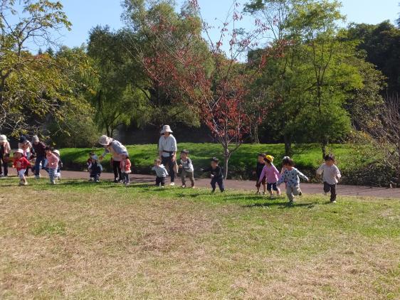 ☆ 風が吹くといっせいに葉っぱが散っていきます、まるで雨みたい!ほら、みてごらん、葉っぱの雨がふってるよ!あっ、葉っぱが追っかけっこしてるよ!葉っぱ、おどってるね!保育者たちの言葉をしっかり覚えているこどもたち。おかあさんたちにも、すぐに応用してみます、はっぱのあめがふってるよ!こどもたちのくちから出ると、一層詩的にきこえませんか?