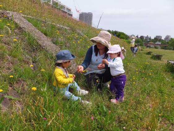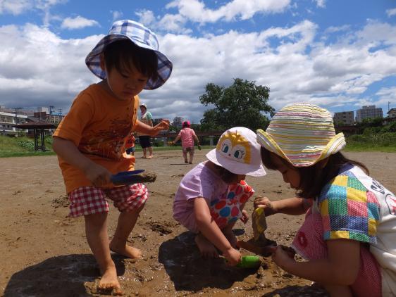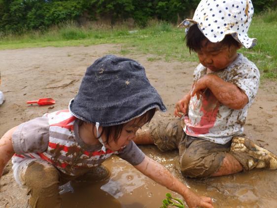 雨に降りこめられた数日、エネルギーはたまる一方です。やっと晴れた金曜日、早速原っぱに繰り出しました。あんなに降ったのに、水はけがいいのか、水たまりはどんどん小さくなっていきましたが、残った水たまりに飛び込んで、思う存分泥んこ遊び!ことに1才さんたちの盛り上がりようったらありません。汚れた顔を、汚れた手でこするので、たちまち真っ黒!はだしの足も黒い靴をはいたみたいになりました。初めての感触かな、あの泥んこのグニュっとした感じ!はじめはおそるおそるの子もいたけれど、なにしろ仲間たちが泥をはねかすものですから、いつのまにかとばっちりでまだらになってしまいます。泥人形みたいになった1才さんは、はだかでベビーカーにつめこまれて帰っていきました。残った2,3才さんたちは、チョコレート工場で働いたみたいな色合いでしばらく楽しんだあと、靴下代わりのビニール袋をはいて園に!たまったエネルギーもほどよく解消されて、お昼寝、とてもよく眠れましたよ。