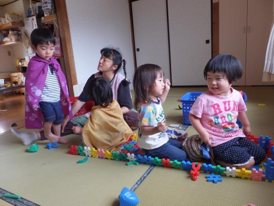 ☆ 雨です・・・先週までせっせと外遊びに出かけていたのですが、週明け早々、雨に降りこめられてしまいました。そとにいくことができないので、今日はみんなでかたつむり作り。1才さんもなかなか上手に色を塗ってましたよ。体力が有り余って、体操にもずいぶん力が入っていましたが、夕方になっても元気いっぱい、賑やかにごっこあそびが始まりました。おひめさま、相手がいないので王子さまをさがしにいったんですけど、さすがいまの子ですよね、携帯で連絡をとったらしく「下にいたって!」とたちどころにみつけてきました。もっとも王子様があらわれる気配はなく、何度か連絡するものの、「うんちしてるとこだって」とか「いまごはんたべてるんだって」とか、いたって庶民的!かつてごっこあそびが得意だった7,8年前のように、「舞踏会」などという言葉はついにでませんでしたが、おもしろかったですよ。