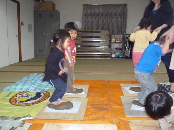 このあいだ、2度目の造形教室がありました。今度は粘土遊びです。本物の、大きくて黒い土粘土、一つ20キロもあるんだって!針金で、カットしたけれど、こねるのも重労働の粘土です。粘土のかたまりに乗っかって、いちに、いちに、と踏んずけたり、ぴょんぴょん飛んだりしてようやく柔らかくなった粘土を丸めて、重ねて、また伸ばして、こどもたちは真剣。特別参加、1才児クラスのH君も頑張ってやってましたよ。ようやくいい感じになったところで、魔法のスープを刷毛につけて、ペタペタペタペタ、真っ白になった粘土に竹串で模様をつけて、見事に出来上がりました。朋子先生が、持って帰ってやいてくれるんだって!陶芸家になったみたいだね。出来上がりが楽しみだ!まぁ、写真をご覧くださいな。