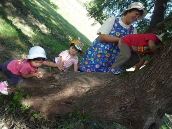 ★ ウォークラリーと芋煮会開催!楽しかったですよー。現役の保育園児と家族、卒園児とその家族、あわせて、エーと何人ぐらいいたのかな?いつものお散歩コースで、木登り、川遊び、砂遊び・・・親子一緒に大騒ぎしてあそんだ後は、醤油味の山形風、味噌味の仙台風、大きな鍋三つの芋煮が待っています。大きなおむすびに、たっぷりの芋煮を堪能して、また遊び・・・おとなもこどもも大満足。昨日まで、一緒に遊んでいたんじゃないか、と勘違いするほど、違和感なく溶け込んでいる卒園生(すっかり大きくなって、ガールズトークを楽しんでいた5年生もいて)に刺激されて、おちびさんたちもいつもよりもっと激しい遊び方をしてました。ほんと、楽しかったですよ!また、来年みんなで集まろうね!た・の・し・み!