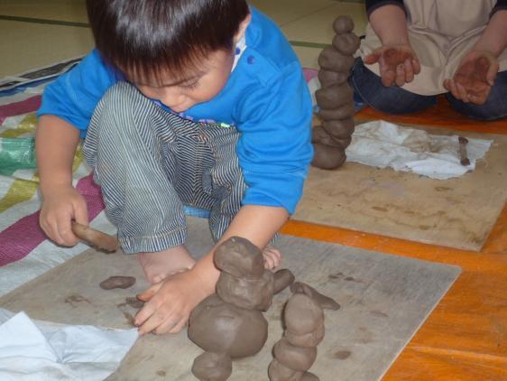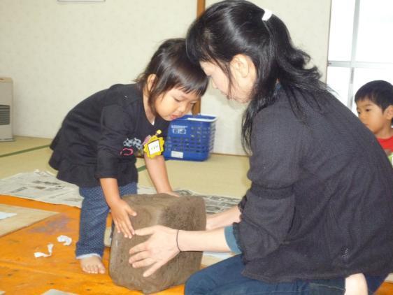 このあいだ、2度目の造形教室がありました。今度は粘土遊びです。本物の、大きくて黒い土粘土、一つ20キロもあるんだって!針金で、カットしたけれど、こねるのも重労働の粘土です。粘土のかたまりに乗っかって、いちに、いちに、と踏んずけたり、ぴょんぴょん飛んだりしてようやく柔らかくなった粘土を丸めて、重ねて、また伸ばして、こどもたちは真剣。特別参加、1才児クラスのH君も頑張ってやってましたよ。ようやくいい感じになったところで、魔法のスープを刷毛につけて、ペタペタペタペタ、真っ白になった粘土に竹串で模様をつけて、見事に出来上がりました。朋子先生が、持って帰ってやいてくれるんだって!陶芸家になったみたいだね。出来上がりが楽しみだ!まぁ、写真をご覧くださいな。