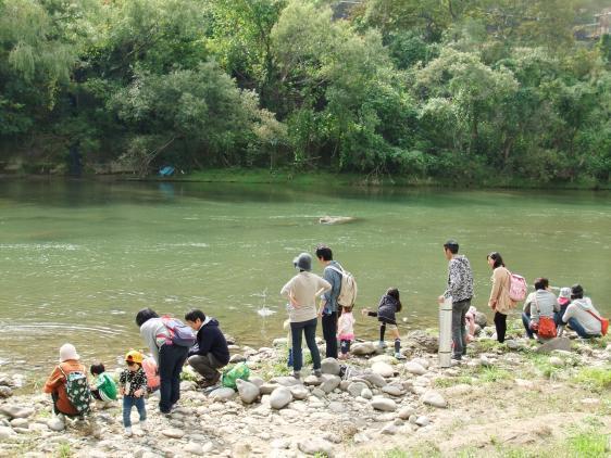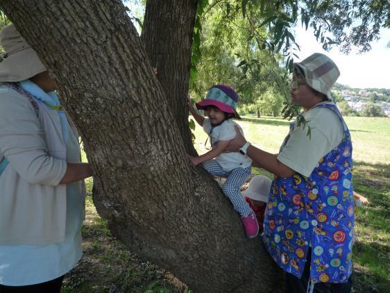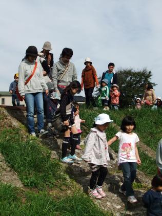 ★ ウォークラリーと芋煮会開催!楽しかったですよー。現役の保育園児と家族、卒園児とその家族、あわせて、エーと何人ぐらいいたのかな?いつものお散歩コースで、木登り、川遊び、砂遊び・・・親子一緒に大騒ぎしてあそんだ後は、醤油味の山形風、味噌味の仙台風、大きな鍋三つの芋煮が待っています。大きなおむすびに、たっぷりの芋煮を堪能して、また遊び・・・おとなもこどもも大満足。昨日まで、一緒に遊んでいたんじゃないか、と勘違いするほど、違和感なく溶け込んでいる卒園生(すっかり大きくなって、ガールズトークを楽しんでいた5年生もいて)に刺激されて、おちびさんたちもいつもよりもっと激しい遊び方をしてました。ほんと、楽しかったですよ!また、来年みんなで集まろうね!た・の・し・み!