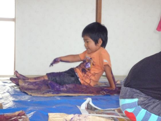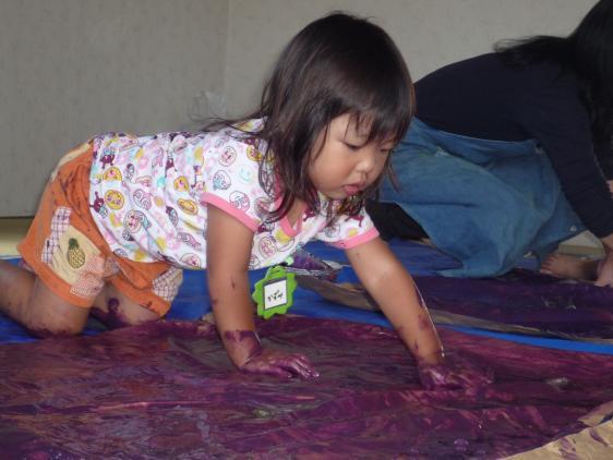 ☆ 2才児さん、造形教室に初挑戦しました。朋子先生が用意してくれたのは、「お芋つくり」どろどろの魔法のスープのなかに、いれるのは、こっちには赤い絵の具、あっちには青い絵の具、ぐるぐるぐるぐるかきまぜて、大きな紙の上にあけて、もっとかき混ぜるとあら不思議!むらさきになっちゃいました!!はじめのうちは恐る恐る、一本指で触っていた子も、いつのまにか大胆に手のひら全体で、べたべたぐちょぐちょ、そのうち足もでてくると絵具の海ですべったりころんだり・・・手も足も、背中まで紫ですよ。お芋の色になった紙をえいやっとひっくり返して、まるめた新聞紙をのせて大きなお芋の形につくって出来上がり!H君、お昼寝のとき、しみじみいってました、「たのしかったねぇ」ほんとに楽しくてねぇ、みんな夢中になってやってましたっけ、はやくお芋が乾くといいなぁ、お家に持って帰りたいなぁ、とちょっと不満顔の子もいましたけど