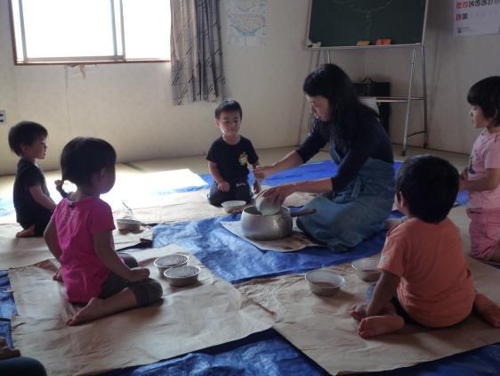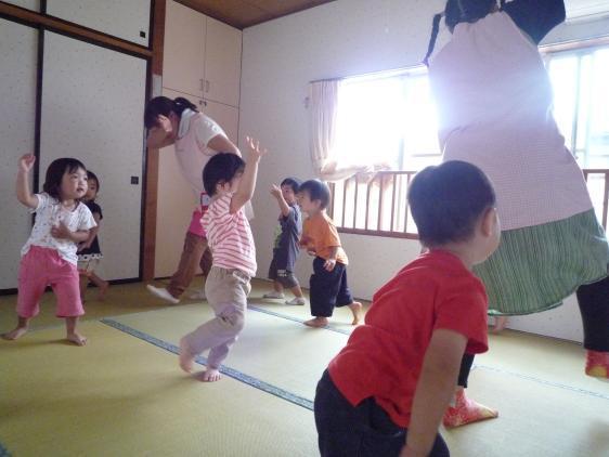 ☆ 2才児さん、造形教室に初挑戦しました。朋子先生が用意してくれたのは、「お芋つくり」どろどろの魔法のスープのなかに、いれるのは、こっちには赤い絵の具、あっちには青い絵の具、ぐるぐるぐるぐるかきまぜて、大きな紙の上にあけて、もっとかき混ぜるとあら不思議!むらさきになっちゃいました!!はじめのうちは恐る恐る、一本指で触っていた子も、いつのまにか大胆に手のひら全体で、べたべたぐちょぐちょ、そのうち足もでてくると絵具の海ですべったりころんだり・・・手も足も、背中まで紫ですよ。お芋の色になった紙をえいやっとひっくり返して、まるめた新聞紙をのせて大きなお芋の形につくって出来上がり!H君、お昼寝のとき、しみじみいってました、「たのしかったねぇ」ほんとに楽しくてねぇ、みんな夢中になってやってましたっけ、はやくお芋が乾くといいなぁ、お家に持って帰りたいなぁ、とちょっと不満顔の子もいましたけど