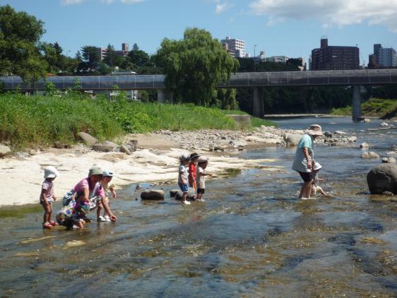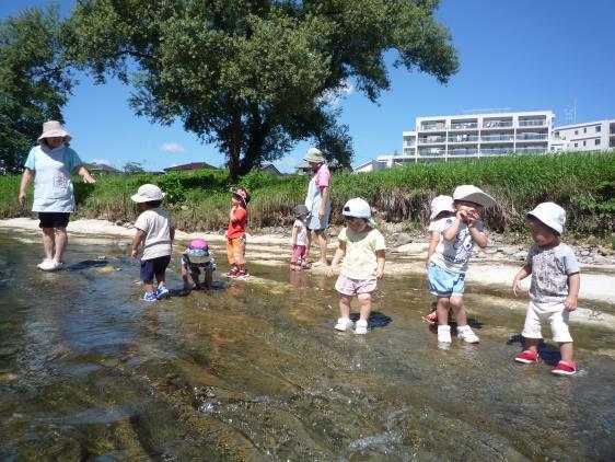 ☆ 梅雨が長くて外遊びができなかった分、水遊び三昧の毎日です。お盆期間、さすがにこどもたちの数もすくなかったので久しぶりに川で遊ぶこともできました。前とちがっておちびさんが増え、川に連れて行くのもドキドキもの。どんぶらこっこと流れていっちゃ大変ですからね。5,6人がいいとこです!石投げしたり、めだかにびっくりしたり、それなりに楽しんできたらしいですよ。こんどは私も連れてってぇ!