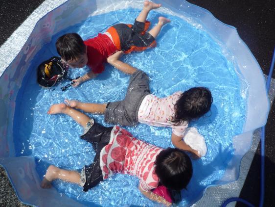 ☆ ひさしぶりの水遊びです。お休みが多くて、プールが広く感じます。女の子に押されていた男の子たちも、どうやら水にはいりおさかなになって泳いだんだって。ゆきこせんせいが水のトンネルも作ってくれたし、明日もたのしみ!晴れるんでしょうね?