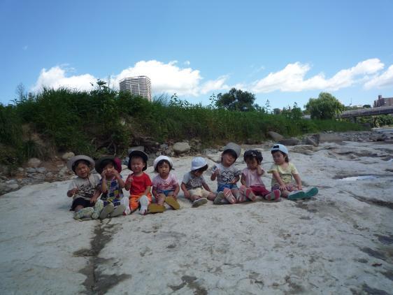 ☆ 梅雨が長くて外遊びができなかった分、水遊び三昧の毎日です。お盆期間、さすがにこどもたちの数もすくなかったので久しぶりに川で遊ぶこともできました。前とちがっておちびさんが増え、川に連れて行くのもドキドキもの。どんぶらこっこと流れていっちゃ大変ですからね。5,6人がいいとこです!石投げしたり、めだかにびっくりしたり、それなりに楽しんできたらしいですよ。こんどは私も連れてってぇ!