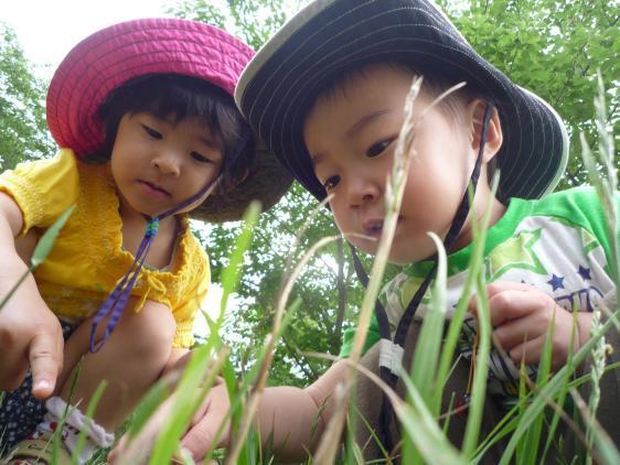 詳しくは、また! ☆この頃、いい天気が続いて外遊びには最高です。地面に幾つも開いた蟻のすみかにかがみこんでほじくってみたり ・・・。自分で探すのがこわいから、ねえねえここにいるんじゃない?と、石をひっくり返すのを下請けにだすRくん、この間、からだに蟻がよじのぼってきて大騒ぎしてましたっけ。Hくんは蟻さんの巣の上にすわってしまい、数匹が圧死。てんとう虫をみると袋に入れたがる人もいて、いずれにしても、こどもたちが遊びに行くと原っぱの虫たちは迷惑顔しているかも!☆保育園の建物は、いま外壁工事の真っ最中。足場をくんで青いネットをかけ、すっかり工事現場に様変わりしています。部屋のなかもネットの色うつして碧くみえます。夏によくやる、海の中ごっこをしたら楽しそうスイミーごっこ、とかね。でもそれは、もうちょっと先!今は足場のうえを通っていくおじさんたちの足に興味津々のこどもたちです。