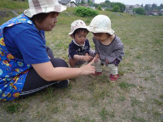 詳しくは、また! ☆この頃、いい天気が続いて外遊びには最高です。地面に幾つも開いた蟻のすみかにかがみこんでほじくってみたり ・・・。自分で探すのがこわいから、ねえねえここにいるんじゃない?と、石をひっくり返すのを下請けにだすRくん、この間、からだに蟻がよじのぼってきて大騒ぎしてましたっけ。Hくんは蟻さんの巣の上にすわってしまい、数匹が圧死。てんとう虫をみると袋に入れたがる人もいて、いずれにしても、こどもたちが遊びに行くと原っぱの虫たちは迷惑顔しているかも!☆保育園の建物は、いま外壁工事の真っ最中。足場をくんで青いネットをかけ、すっかり工事現場に様変わりしています。部屋のなかもネットの色うつして碧くみえます。夏によくやる、海の中ごっこをしたら楽しそうスイミーごっこ、とかね。でもそれは、もうちょっと先!今は足場のうえを通っていくおじさんたちの足に興味津々のこどもたちです。