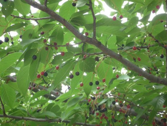 そして、今いちばんのおすすめは、さくらんぼがたわわに実った桜の木、枝のあいだからみえる空のいろと、紅や臙脂色の実、明るい緑の葉、せめて写真ででもごらんください。こどもたちの楽しみは袋にさくらんぼをいれてもらい、“おみやげ”にすることですけど、けっこうジャムかなんかになりそうなんですよね。