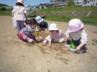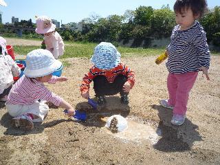 ☆ さむくなったり、あったかくなったり、ついていくのが大変な日々!でも、たまにはぴっかぴかのいい天気が続くこともあって、ほっと一息です。昨日はそんな日、ペットボトルに水をつめて、原っぱへGo!!水をまいて、泥んこ製造、どろどろにちゃにちゃの中にとびこんだり、バケツに入れて、もっとどろどろにしてみたり、思い切り泥の感触を楽しみました。お互い様に、泥をはねらかしたり、人の上にたらしたり、きれいな服がたちまちきれいじゃなくなりましたけど・・・去年、上から下まで茶色の塑像に変身していたRちゃんは、適度な遊び方を習得したらしくつつましくあそんでいましたが、新1才児は恐れ気もなく泥のなかにとびこんでいましたから、やっぱり1年たつと成長するんですね!