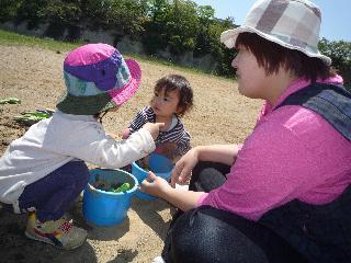 赤ちゃんたちもベビーカーにのって、おさんぽできるようになりました。あたたかい日差しに、思わず眠くなってしまうこともありますが、気持ちよくおしゃべりしながら、カタコトとベビーカーに揺られ満足そうなちびちゃんたちです。土手にはからすのえんどう、ぶたな・・・たんぽぽはそろそろ綿毛になって、ようやく春本番。まだまだ、初夏というには肌寒い今年ですが、空はきれいな青、とんびが大きく輪をかいています。