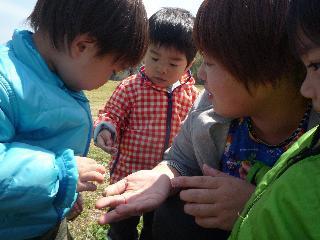 ☆ ひとつづつクラスがあがり、ちょっぴり大きくなったこどもたち。ちょっと前まではバギーに乗っておさんぽに出ていた1才さんですが、5月からはもう少し成長を期待され、歩いていくことになりました。大きな聡子先生にくっついて、トコトコ歩いている様子はまるでかるがもの親子のようです。かっわいい!!