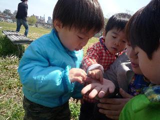 ☆ ひとつづつクラスがあがり、ちょっぴり大きくなったこどもたち。ちょっと前まではバギーに乗っておさんぽに出ていた1才さんですが、5月からはもう少し成長を期待され、歩いていくことになりました。大きな聡子先生にくっついて、トコトコ歩いている様子はまるでかるがもの親子のようです。かっわいい!!